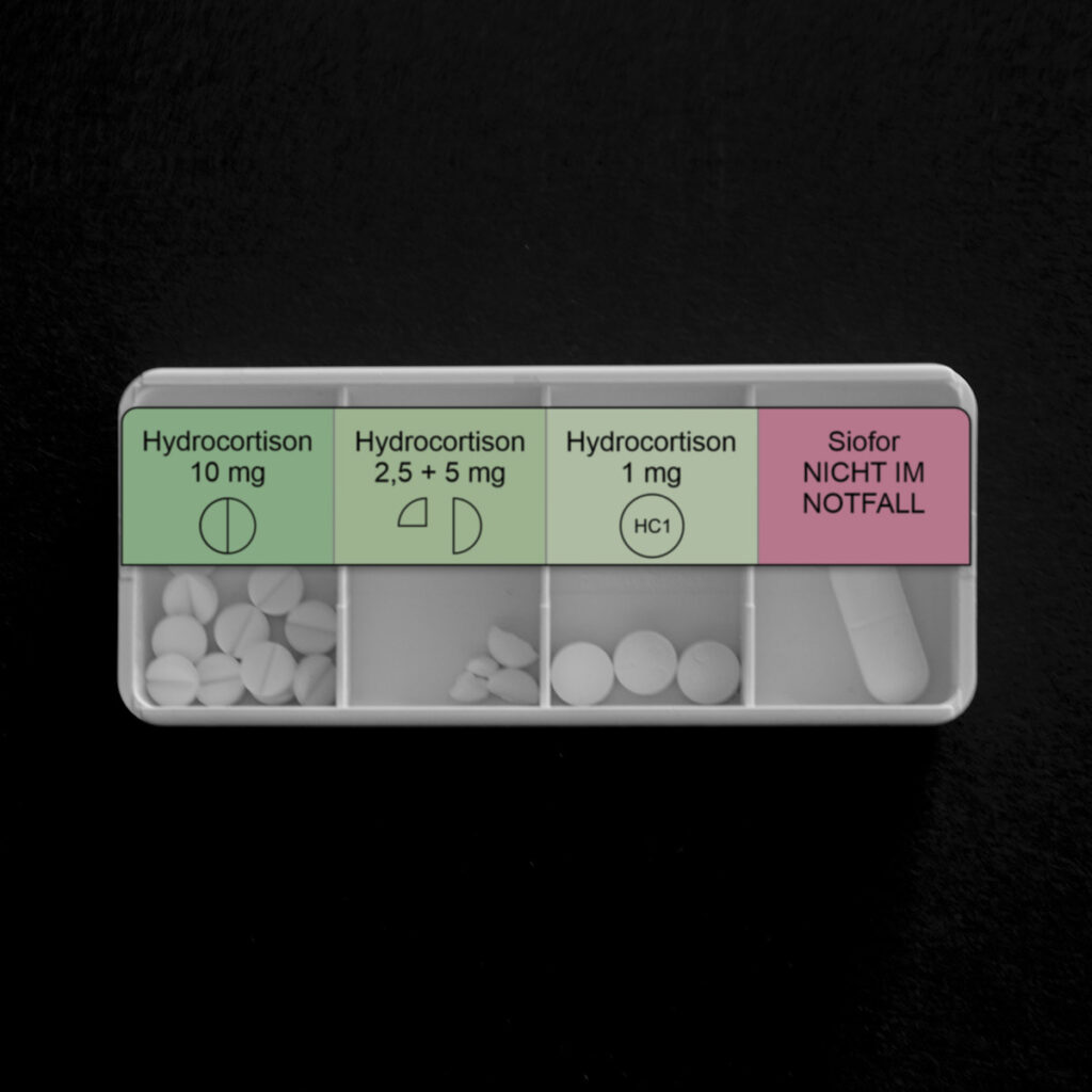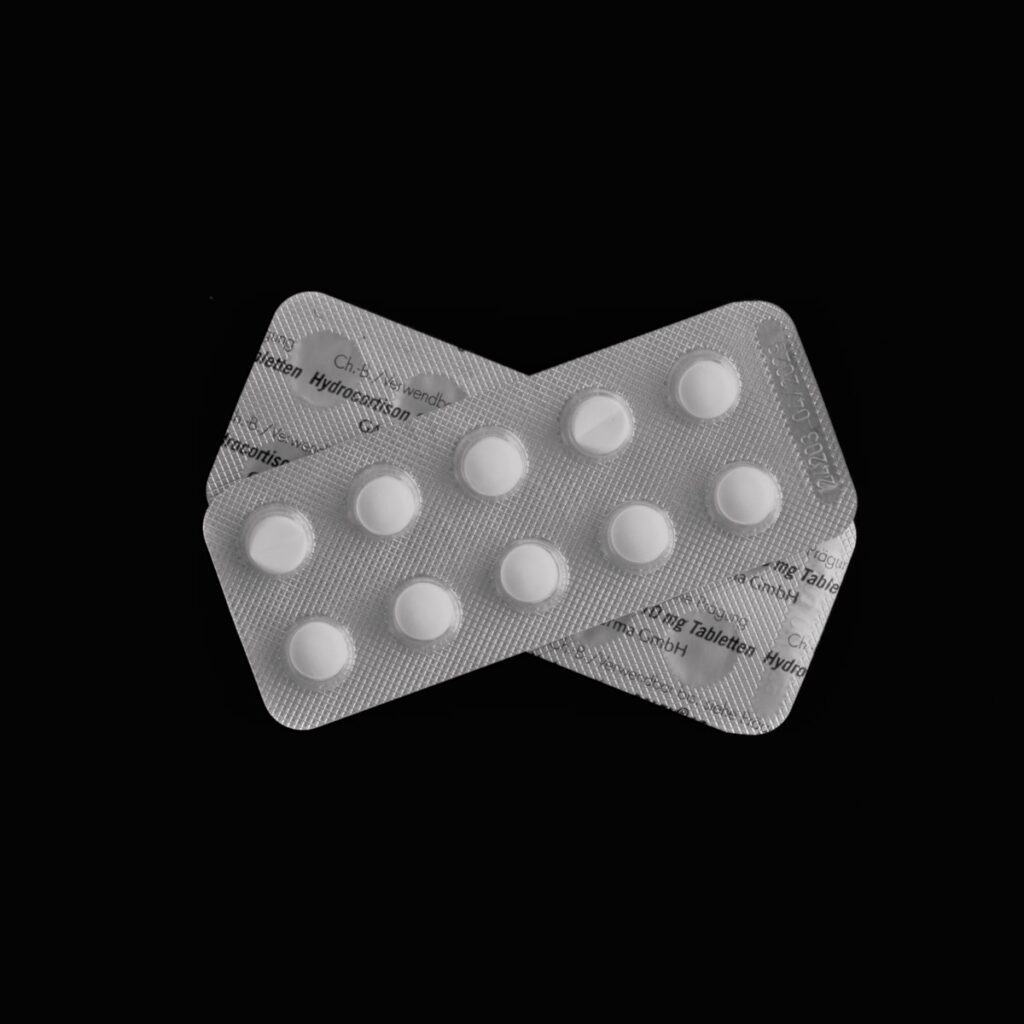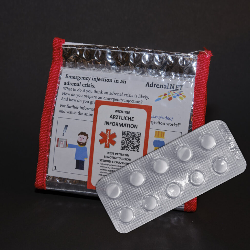 Ik heb de noodkit niet bij me of het kan niet worden gevonden, dus er moet ten minste ergens in mijn zakken een strook met Hydrocortison (10 mg) tabletten.